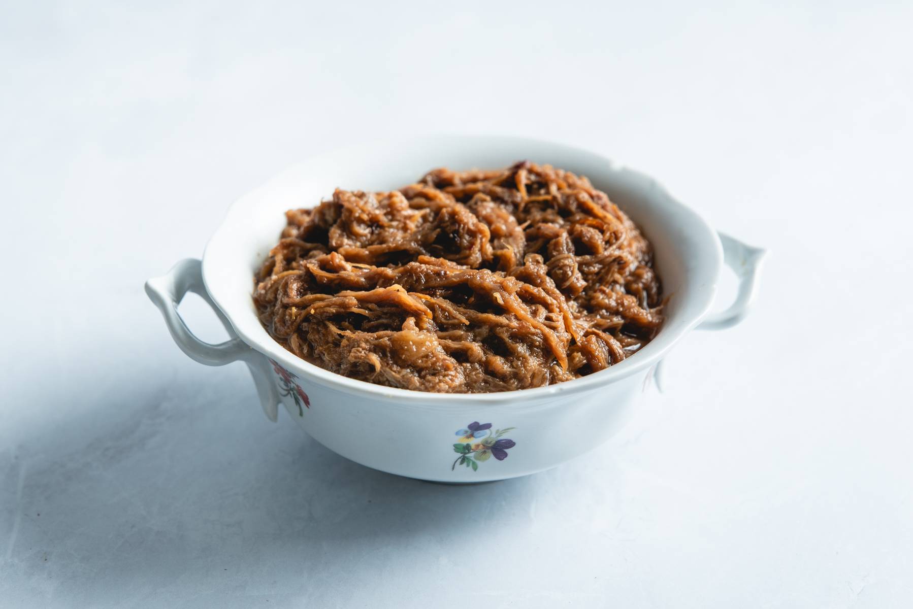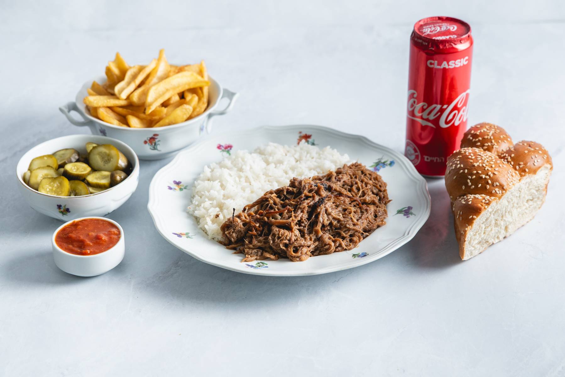 אסאדו מפורק עטוף באהבה על מצע של שום קונפי, ברביקיו וכרוב כבוש.
