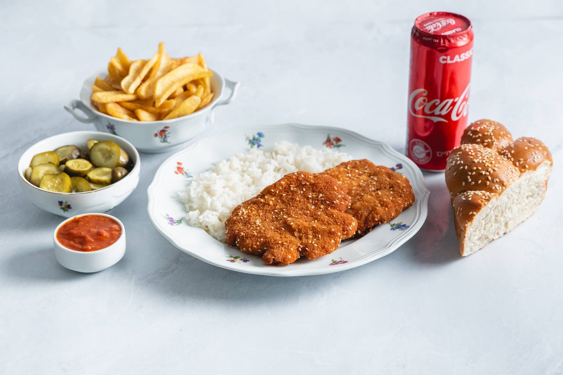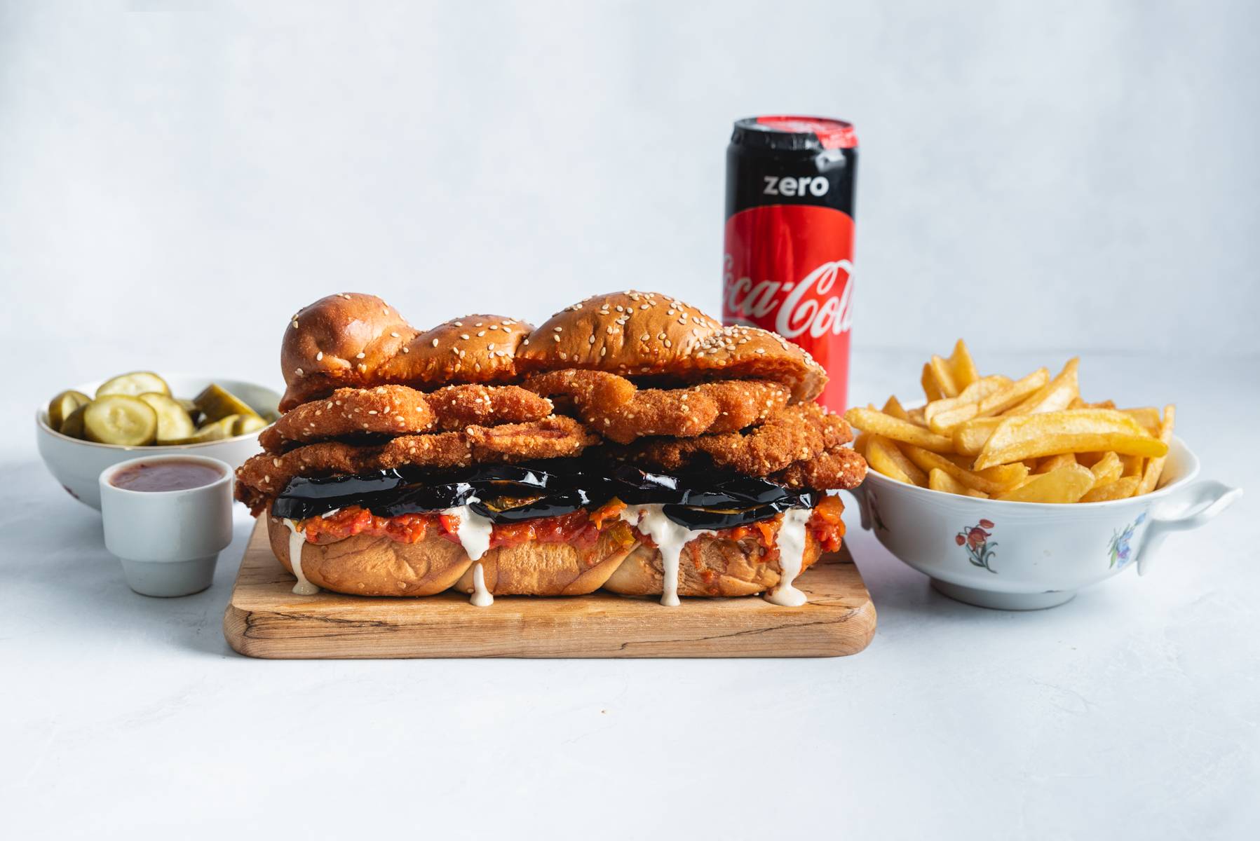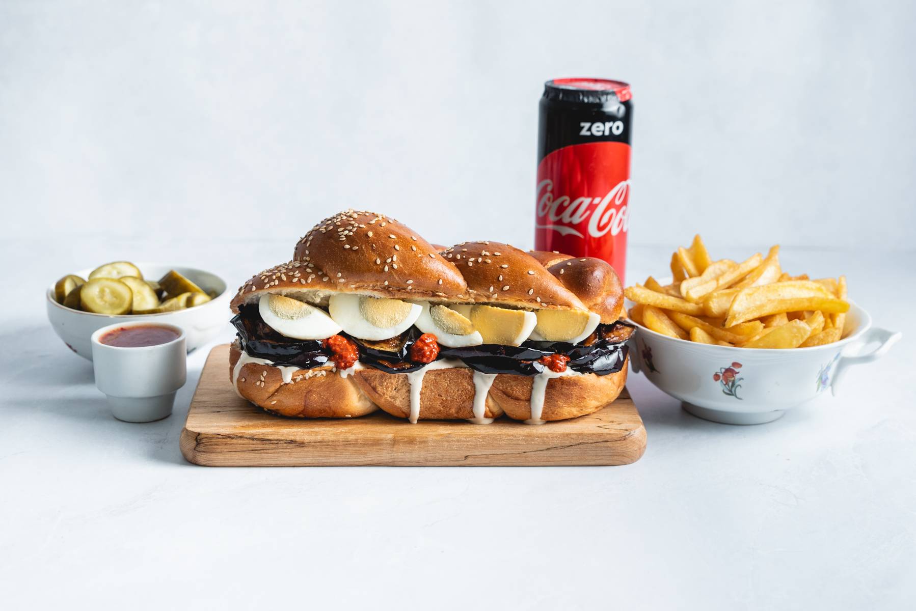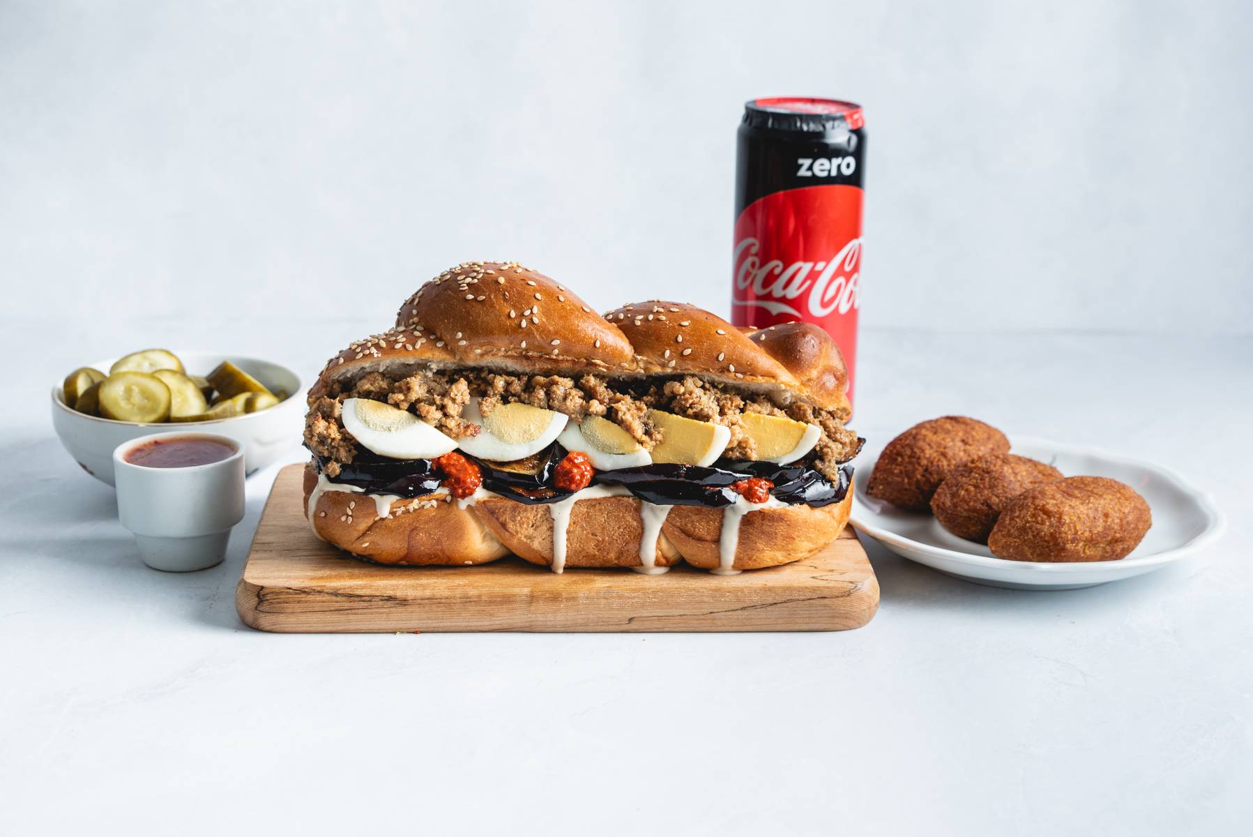 חלת שניצל קריספי עם טחינה, מטבוחה וחציל - שילוב מנצח!